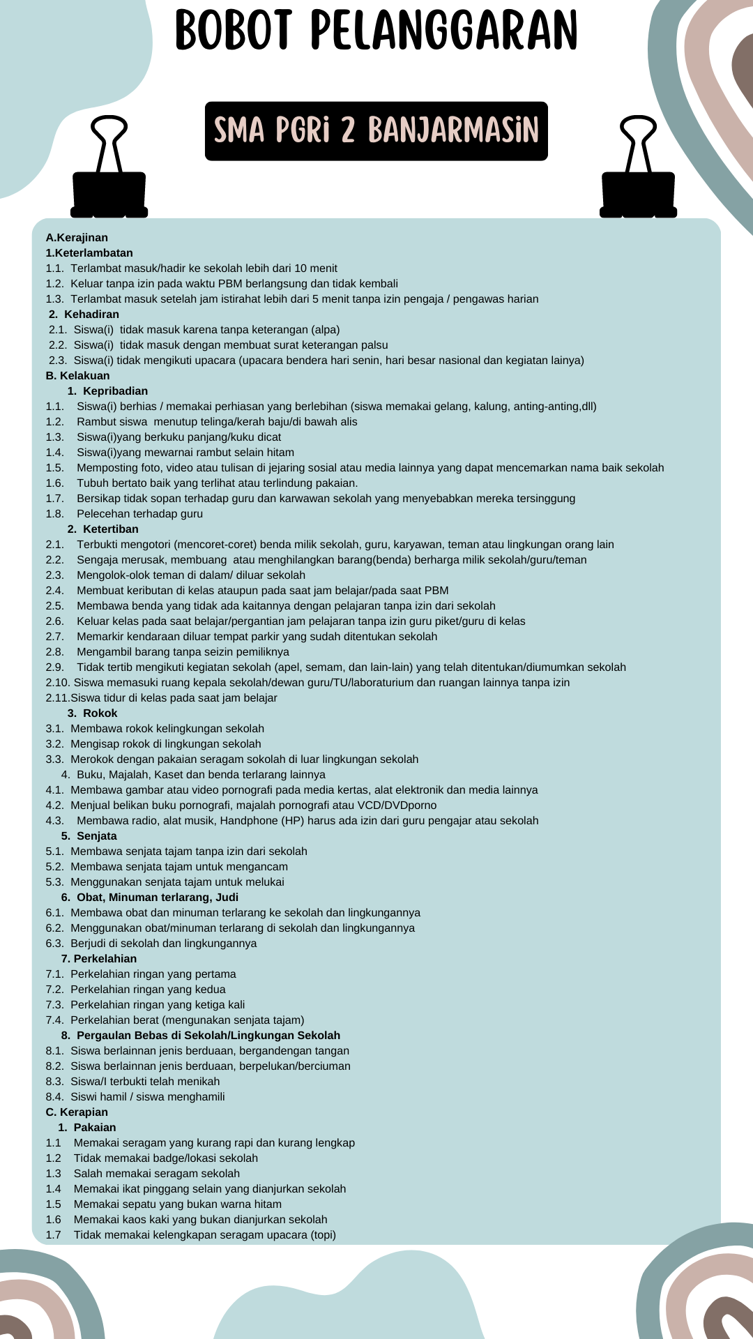 Setiap siswa yang melanggar tata tertib sekolah akan diberikan sanksi dalam bobot poin, berdasarkanpelanggaran yang dibuatnya. Apabila seorang siswa sudah mencapai bobot 100 poin, maka siswa tersebut akan dikembalikan pada orang tuanya, dikeluarkan dari sekolah. Bobot 100 poin berlaku selama siswa belajar di SMA PGRI 2 Banjarmasin.